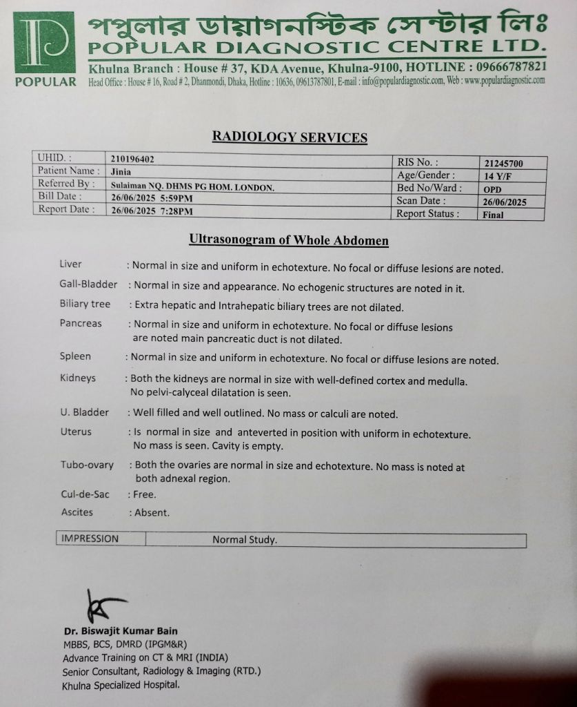 এখন আমাদের হোমিওপ্যাথি ফিলোসফি অনুযায়ী অনেক সময় রোগের উৎপত্তি হয় মন থেকে এটা তার বড় প্রমাণ কারণ হচ্ছে এই Patient এর USG রিপোর্ট অনুযায়ী বিভিন্ন Organ যেমন Liver, Kidney, Spleen, Uterus, Gall bladder, Ovary, Urinary bladder etc. is well বা ভালো। তাহলে প্রশ্ন হচ্ছে কেনো patient এর ব্লাডে এই পরিবর্তনগুলো হোলো? এর উত্তর প্রথমে আমি দিয়েছি আর তা হলো দুশ্চিন্তা। মেয়েটি দুশ্চিন্তার জন্য খাবারও খেতে পারে না। আমি তার চোখে পানি দেখলাম আর দেখলাম একটা সমাধান হীন পারিবারিক সমস্যার দুশ্চিন্তার সমুদ্র যেটা এই মাত্র ১৪ বছর বয়সী মেয়েটাকে শেষ করে দিচ্ছে। আমি তাকে হোমিওপ্যাথির নীতি অনুযায়ী মেডিসিন দিলাম এবং কিছু মেন্টাল সাপোর্ট/এডভাইস বা সাইকোলজিক্যাল সাপোর্ট/এডভাইজ দিলাম। আশা করি ইনশাআল্লাহ সুস্থ হয়ে যাবে, কিন্তু এই পেশেন্টটির সুস্থতা অনেকটা নিজের উপরও ডিপেন্ডে করছে।