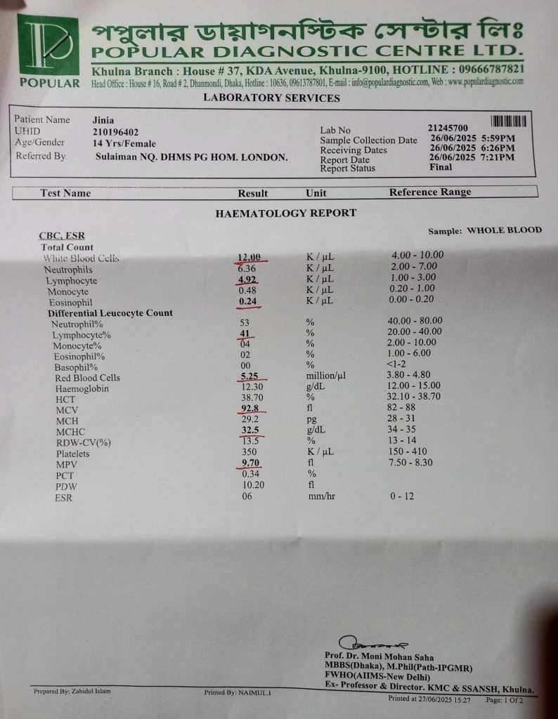 দুশ্চিন্তা থেকে দূরে থাকুন। কেন বলছি? নিচের রিপোর্টগুলো একটি বালিকার যার বয়স মাত্র ১৪ বছর। মেয়েটি পারিবারিক সমস্যার কারণে Anxiety তে ভুগছে। মেয়েটির প্রধান সমস্যা পেটে ব্যাথা। প্রথমে আমি লক্ষণ অনুযায়ী ভেবেছিলাম এপেন্ডিসাইটিস হয়েছে। সেইজন্য এই রিপোর্টগুলো করতে দেই। রিপোর্ট অনুযায়ী মেয়েটার কোন Appendicitis এর সমস্যা নেই। কিন্তু মেয়েটার প্রস্রাবে অর্থাৎ Urine infection এবং Blood infection, Allergy হয়েছে এবং May indicate mild infection or inflammation. Slightly abnormal and may suggest early signs of anemia and inflammation. In future she will be animic patient অর্থাৎ আস্তে আস্তে মেয়েটি রক্তশূন্যতায় পড়তে শুরু করেছে।